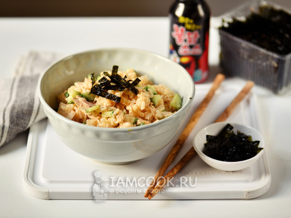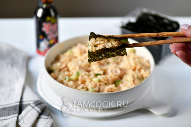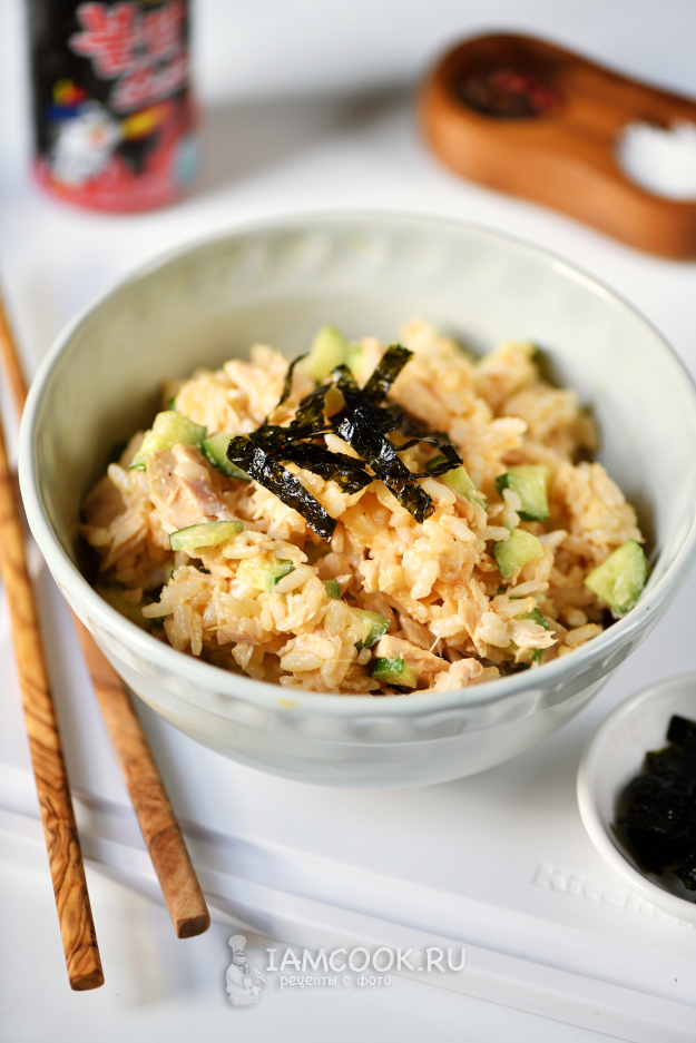 Есть рис с консервированным тунцом принято именно так: в листик закусочных водорослей нори кладем рис с тунцом, обязательно ломтик огурца и прижимаем палочками, как показано на фото.