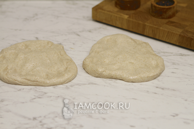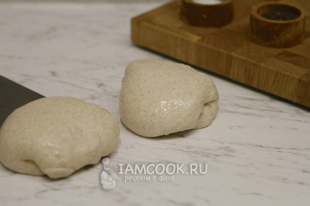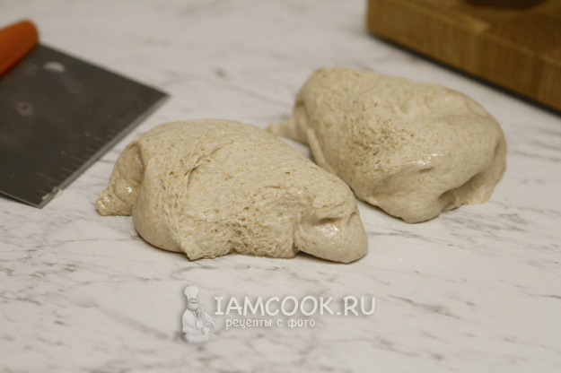 Выложите тесто на рабочую поверхность и разделите его на 2 равные части.