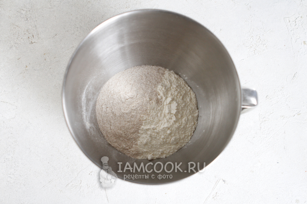 Тесто можно замесить вручную или в хлебопечке. Я замешивала в миксере. В чашу отправляем два вида муки.