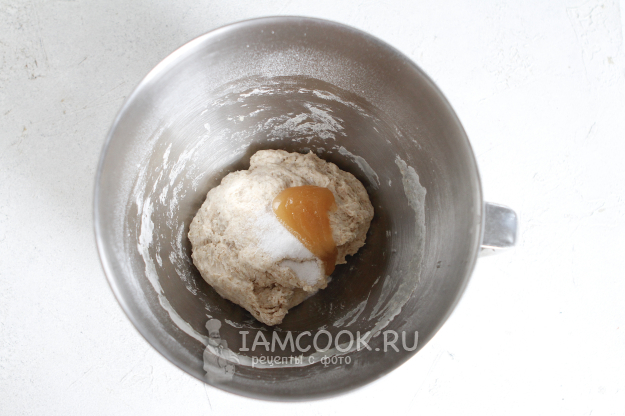 Когда тесто собралось в шар, добавила соль и мёд. И продолжила замес на второй скорости миксера. Вымешивала тесто еще примерно 3 минуты.