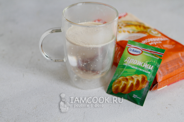 Слегка подогрейте воду, температура должна быть не выше 40 градусов. Добавьте в нее немного сахара, буквально щепотку, и сухие дрожжи, перемешайте все до однородности.