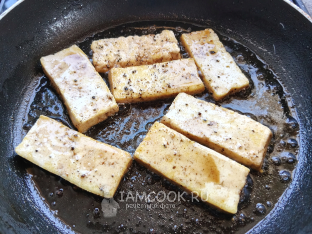 Тофу обжарить на масле до румяного состояния, в конце полить соевым соусом, поперчить, убрать с огня и дать немного настояться.