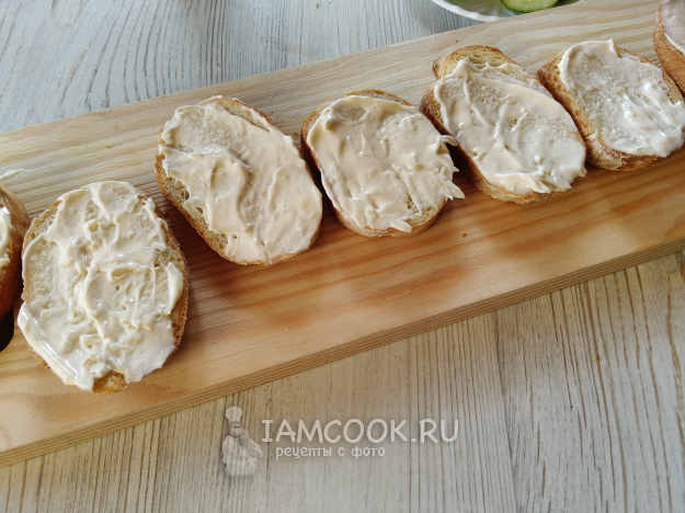 Промазать каждый кусочек чесночным майонезом.
