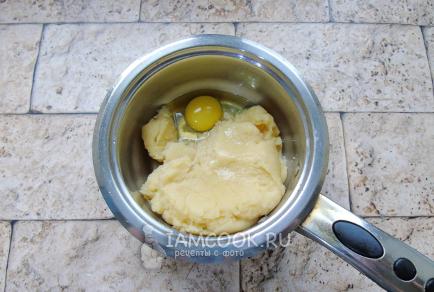 Тесто немного охладите и по одному добавьте яйца, каждый раз тщательно перемешивая. Я переложила тесто в кастрюлю без антипригарного покрытия, чтобы перемешать яйца миксером с металлическими насадками. Можно перемешать обычной ложкой.