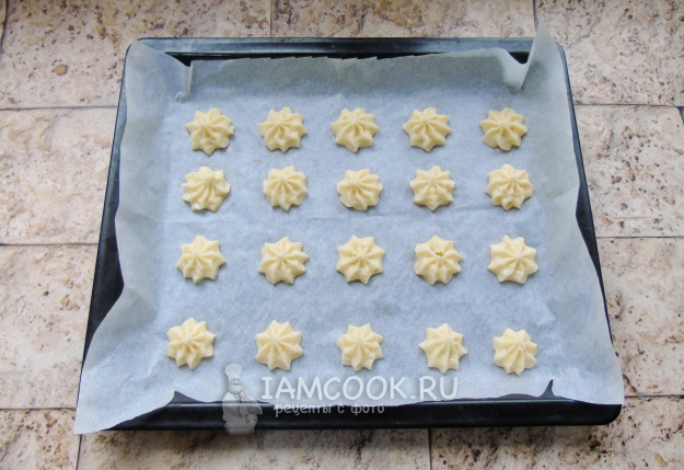 На противень с пекарской бумагой отсадите небольшое печенье на расстоянии друг от друга.