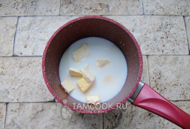 В кастрюлю налейте воду и молоко. Добавьте сливочное масло.