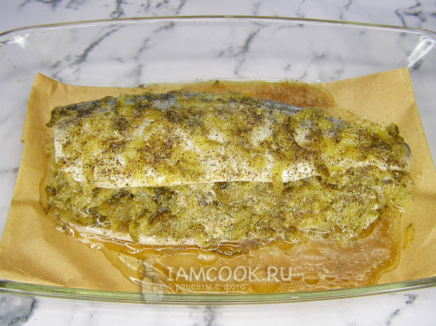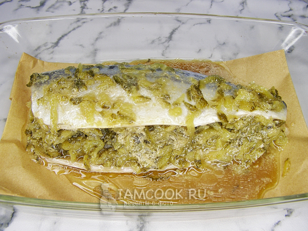Обмазываем скумбрию огуречно-масляной смесью со всех сторон и внутри. Оставшуюся огуречную смесь закладываем внутрь рыбы. Перекладываем на противень или в форму, застеленную бумагой для выпечки или силиконовым ковриком.