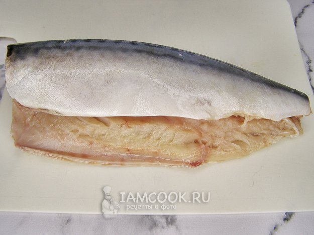 У скумбрии отрезаем голову и хвост. Разрезаем брюхо, удаляем внутренности и обязательно убираем чёрную плёнку. Нижние плавники нужно срезать, верхний можно оставить или просто срезать ножницами. Ополаскиваем рыбку прохладной водой и просушиваем бумажными салфетками.