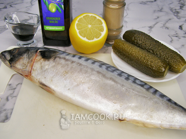 Соберём необходимые продукты для приготовления скумбрии с солёными огурцами в духовке. Если скумбрия замороженная, то её нужно заранее разморозить в холодильнике. Масло лучше всего взять оливковое, но если его нет, можно заменить любым другим растительным.