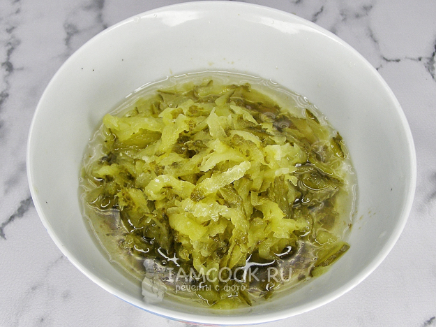 Солёные огурцы натираем на крупной тёрке и перекладываем в миску с маслом и соевым соусом. Ещё раз всё перемешиваем.