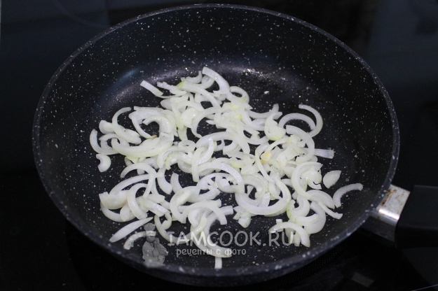 На небольшом количестве масла (растительного, топлёного или сливочного с растительным) обжарьте на среднем огне при помешивании нашинкованный лук. В процессе слегка посолите. В конце добавьте давленый зубчик чеснока.
