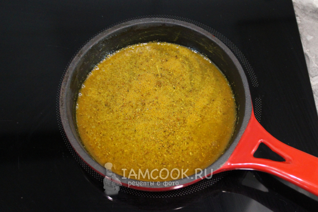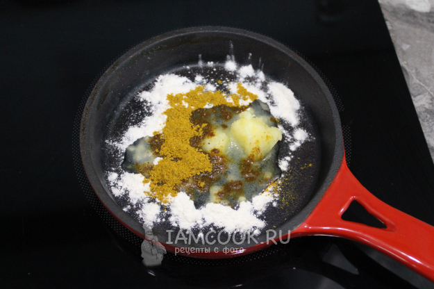 На маленькой сковороде на среднем огне подсушите муку и смесь карри при помешивании около минуты. Добавьте сливочное или топлёное масло, постоянно помешивайте! Оно быстро расплавится и соединится с мукой и специями.