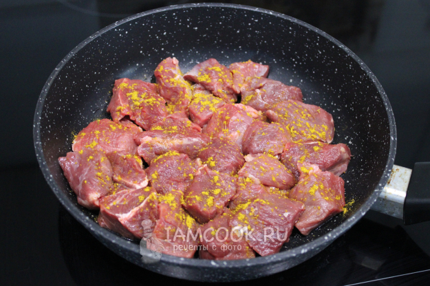 Куски говядины посыпьте порошком карри. После лука на этой же сковороде обжарьте их при помешивании на сильном огне.