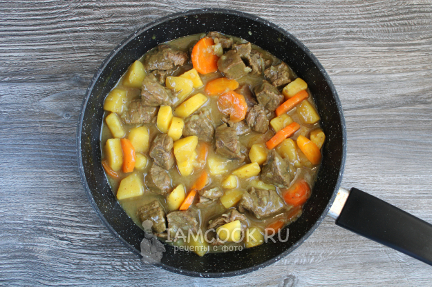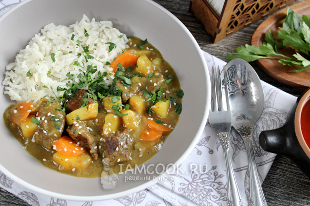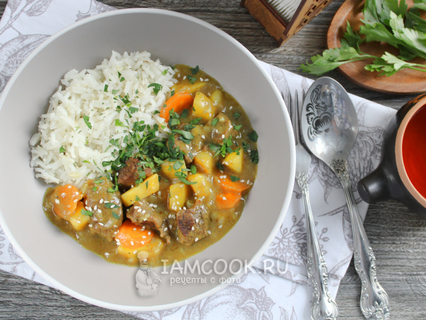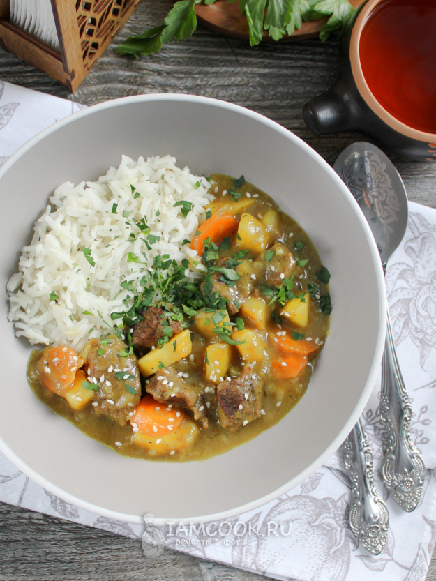 Для варианта карри подготовьте ингредиенты по списку к рецепту. От сорта выбранной говядины будет зависеть время приготовления. Кроме картофеля, моркови и лука могут быть добавлены яблоки или грибы.