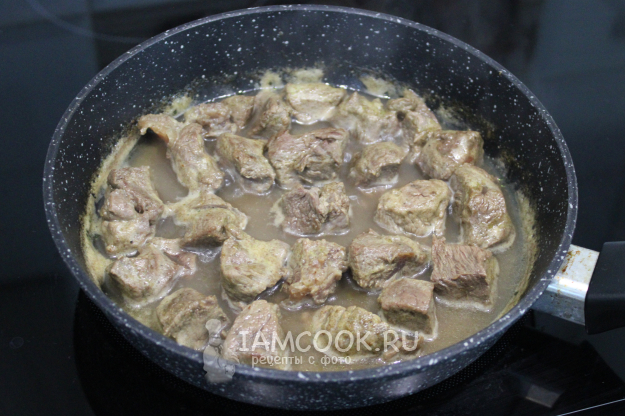 Когда поверхность мяса запечатается со всех сторон, влейте горячую воду в количестве 200 мл. После закипания убавьте огонь до слабого и тушите до готовности мяса под крышкой. Время может варьироваться, но на меньше часа не рассчитывайте.