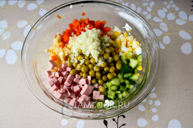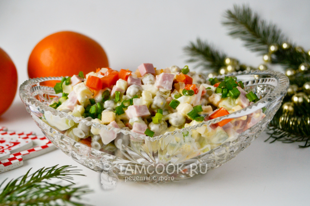 Пожалуй, у каждой семьи есть свой фирменный рецепт салата Оливье, с которым связана какая-то история, воспоминание. В семье моих родителей салат обычно готовили с вареной говядиной, так любил папа. Я же в детстве любила с молочной колбасой. Иногда к основным продуктам – картошке, моркови, яйцам - добавляли кисло-сладкое мелко-мелко нарезанное яблоко, вместо маринованного зеленого горошка добавляли кукурузу, а маринованный огурец заменяли на свежий. Мясная составляющая была в зависимости от того, что удалось достать-купить. Но новогодний стол без Оливье был немыслимым.