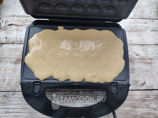 Включить вафельницу, форму смазать растительным маслом. Выложить тесто в форму для гонконгских вафель, закрыть прибор. Готовить в течение 5-6 минут.