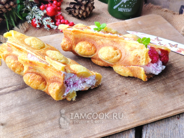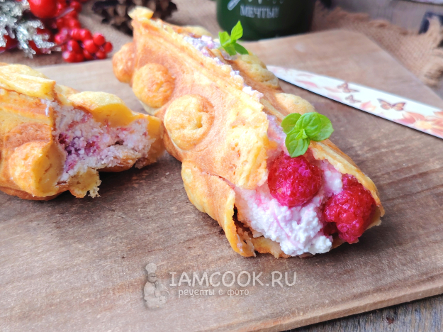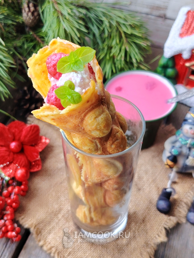 Аккуратно вынуть гонконгские вафли из вафельницы, можно срезать края по желанию, сразу свернуть в рожок и поместить в стакан, чтобы они сохранили форму. Наполнить по желанию вафли сладкой начинкой. Приятного чаепития!