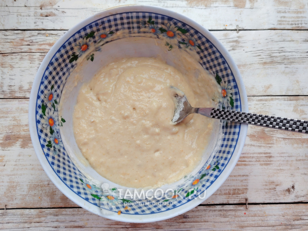 Всыпать соединенные и просеянные муку, крахмал и разрыхлитель. Размешать массу. Тесто должно получиться густым.