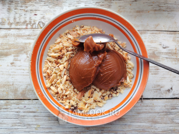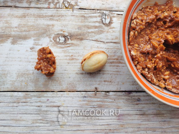 Наполнить начинкой скорлупки, соединить их, чтобы получились орешки.