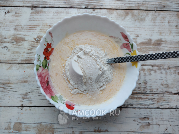Просеять муку и добавить частями в посуду со смесью. Всыпать соду, гашенную уксусом, либо разрыхлитель.