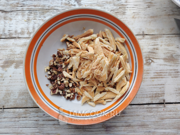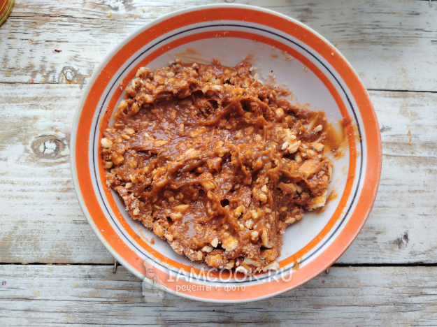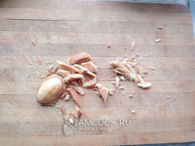 Грецкие орехи освободить от скорлупы, соединить с обрезками теста.