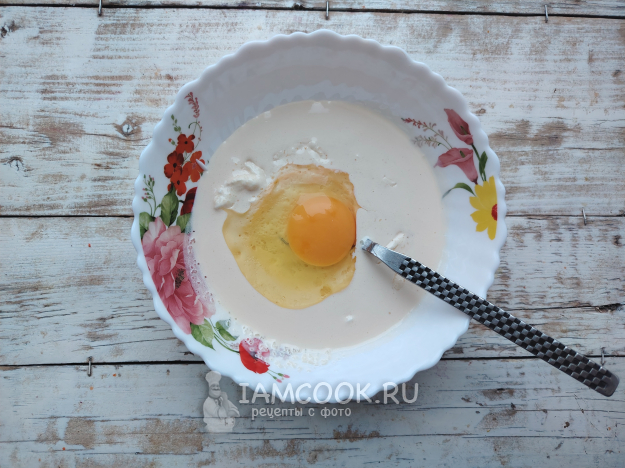 Добавить сметану и вбить яйцо, размешать массу.