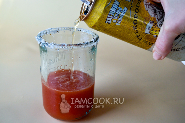 Влейте пиво. Перемешайте, чтобы почувствовать вкус. Если необходимо, то добавьте еще пару капель табаско или устричного соуса.