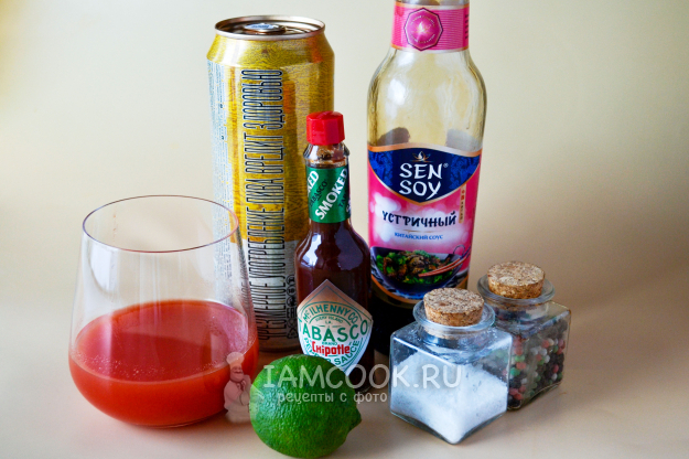 Соберите продукты для приготовления мексиканского пивного коктейля Мичелада с томатным соком.