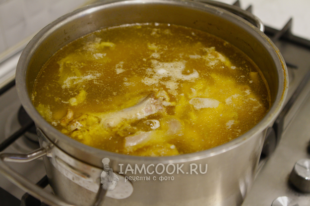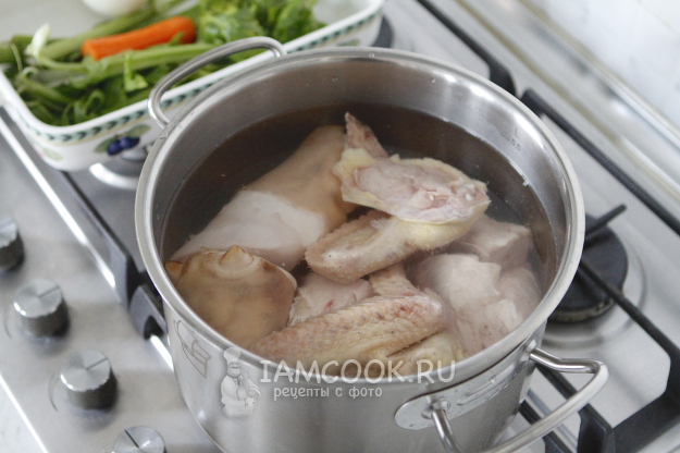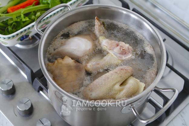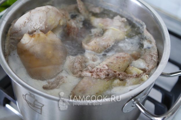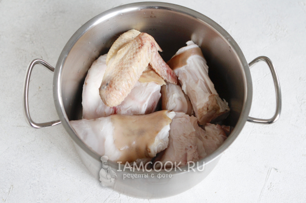 Уложила все в кастрюлю, залила холодной водой и отправила на плиту. Количество воды указываю приблизительное. Вода должна полностью покрыть ножки, мотолыжку и крылья.