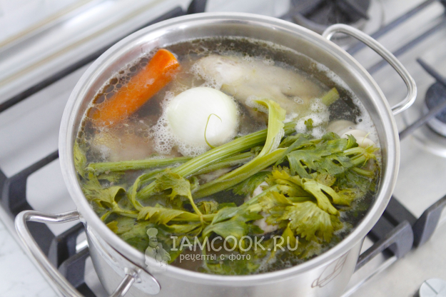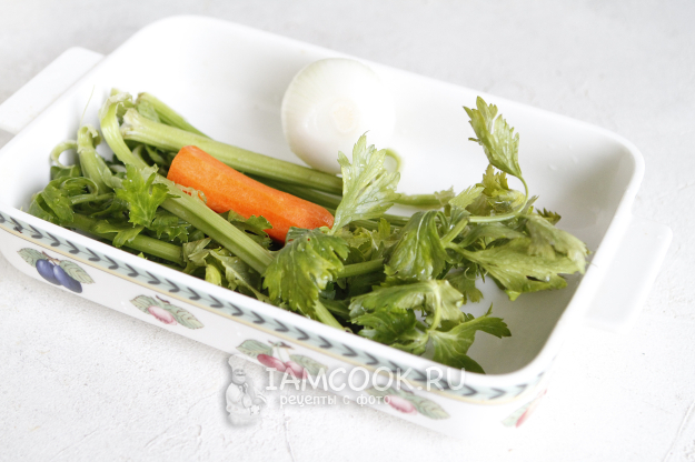 В этом рецепте использовала минимальный набор овощей: лук, морковь и стебли сельдерея. Все овощи и зелень я добавляла в бульон для более насыщенного вкуса и варила их около 4 часов.