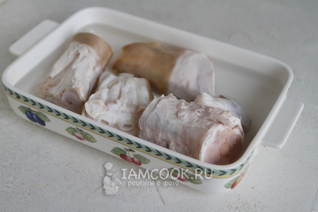 На приготовление холодца я выделяю 2 дня. Процесс, конечно, не быстрый, но результат стоит того, поверьте. Говяжью ножку я вымачивала в холодной воде сутки. А мотолыжку говяжью - почти 10 часов. Крылья индейки у меня были замороженные, я разморозила их с вечера.