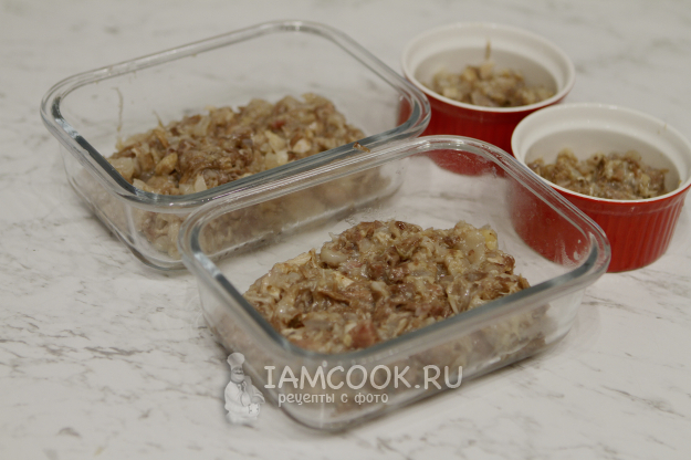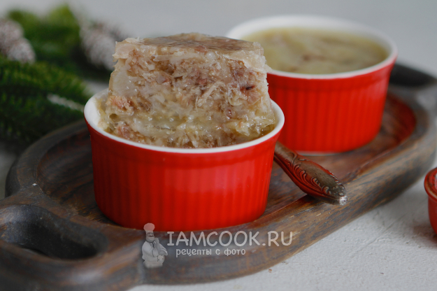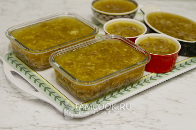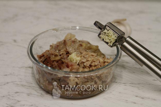Нарежьте мясо и желеобразные части на кусочки и перемешайте с мелко нарезанным чесноком.