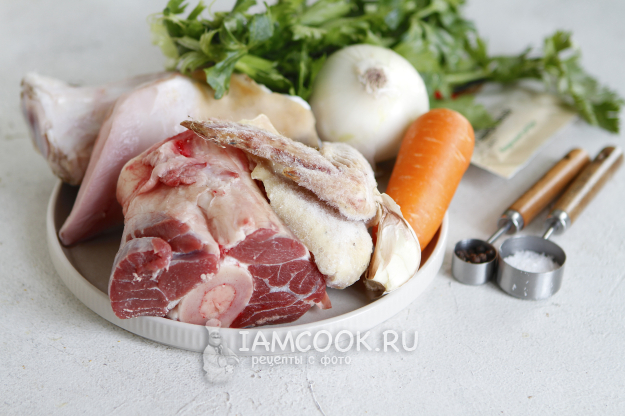 Соберите все продукты по списку и приступим к приготовлению сборного холодца из говядины и индейки.