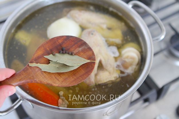 Через 2 часа после закипания добавьте лавровый лист и перец горошком. На этом же этапе я немного солю холодец. А окончательно досаливаю уже в самом конце.
