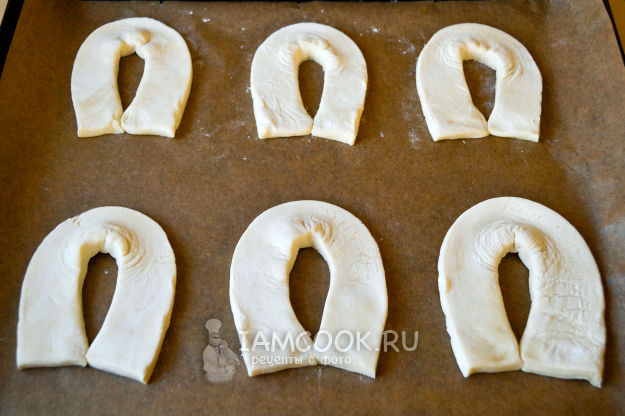 Противень застелите пекарской бумагой. Положите полоски теста на противень, придав им форму подковы. Соедините кончики, чтобы зафиксировать заготовки.