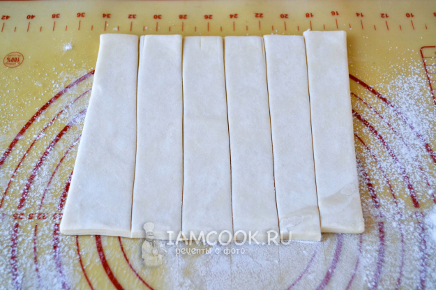 Посыпьте доску мукой и положите пласт теста. Не раскатывая, разрежьте тесто на 6 равных полосок.