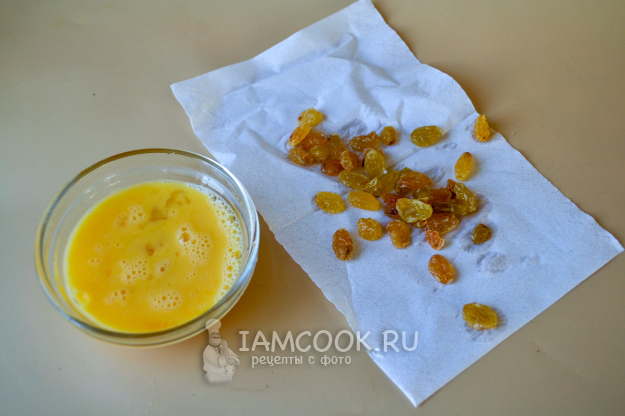 Яйцо разбейте в мисочку, взболтайте, изюм обсушите на бумажном полотенце.