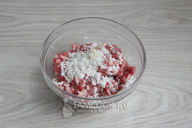 Лук мелко нашинкуйте, чеснок измельчите и соедините это всё с мясным фаршем. Слегка посолите и перемешайте. В данном варианте специи не добавляю, потому что для интересного вкуса вполне хватит лечо.