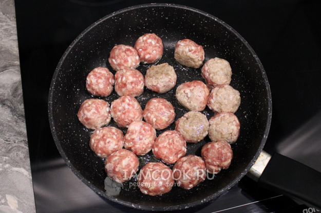 Сформируйте одинаковые круглые заготовки размером с грецкий орех и по-быстрому обжарьте их на среднем огне на растительном или топлёном масле (или смеси растительного со сливочным) со всех сторон. Советую подобрать такую сковороду с высокими бортами, чтобы заготовки были уложены в один слой.