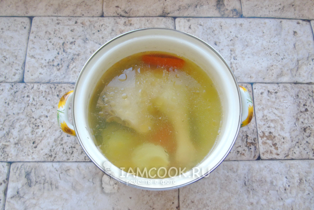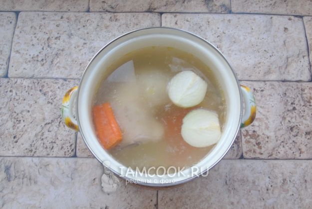 Доведите до кипения, огонь убавьте до минимума и снимите пену. Выложите лук и морковь.