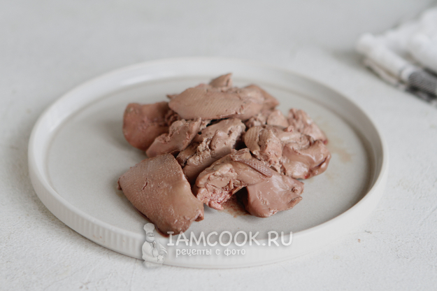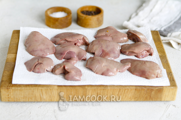 Куриную печень замочите в холодной воде на 30 минут. Промойте, срежьте прожилки, зачистите от сгустков крови и высушите на бумажном полотенце.