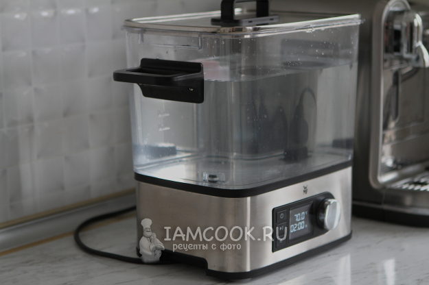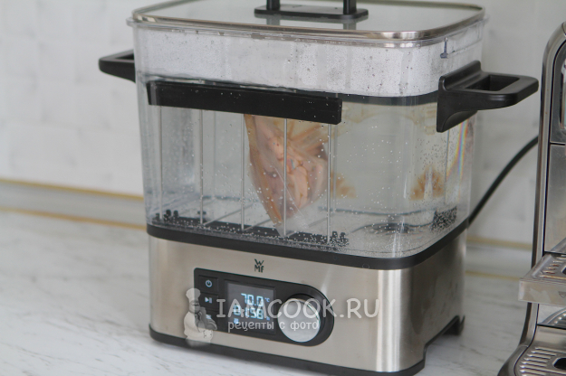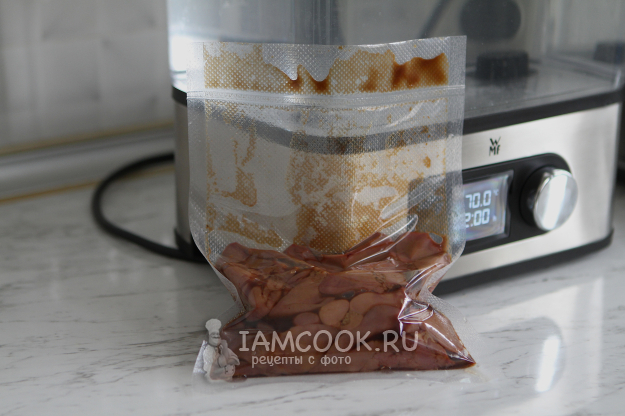 Когда вода нагреется до нужной температуры, опустите пакет с печенкой и готовьте куриную печень су-вид (сувид) 2 часа.