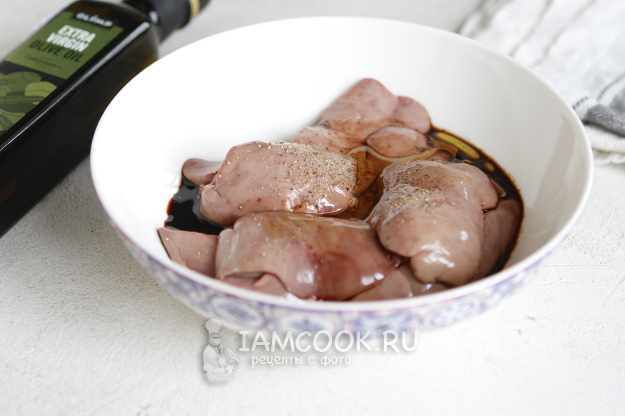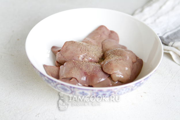 Кусочки печени переложите в чашу. Добавьте немного соли и черного молотого перца.