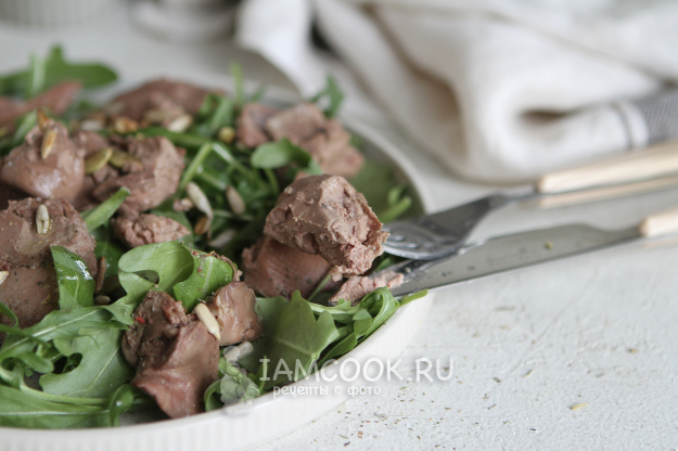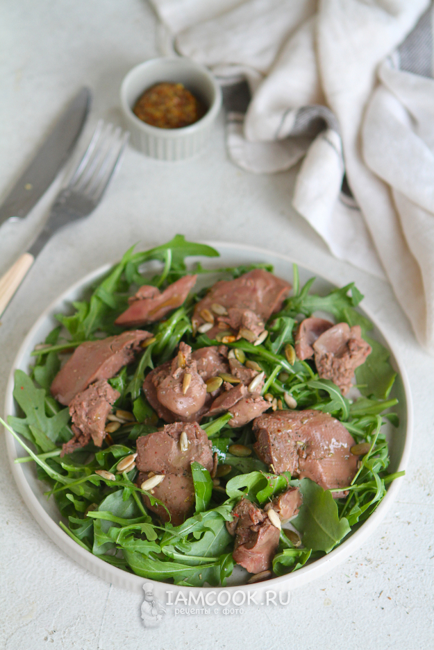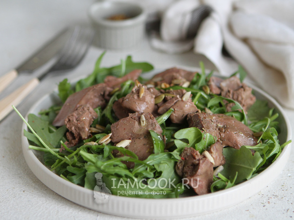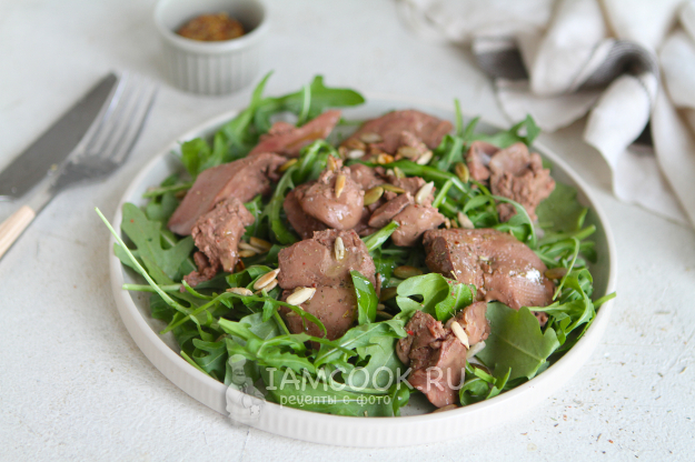 Сначала думала приготовить к печенке легкий гарнир, но в самый последний момент отказалась. Решила приготовить теплый салат из печенки с руколой и семечками. Заправила салат оливковым маслом.