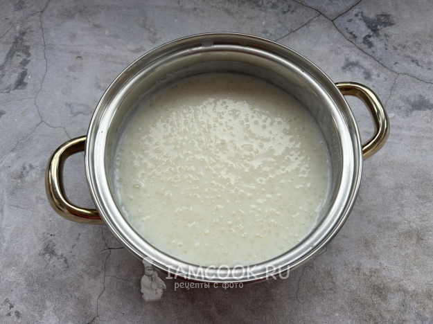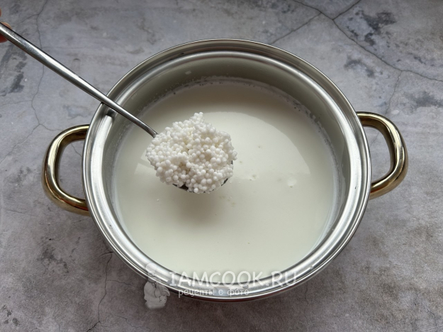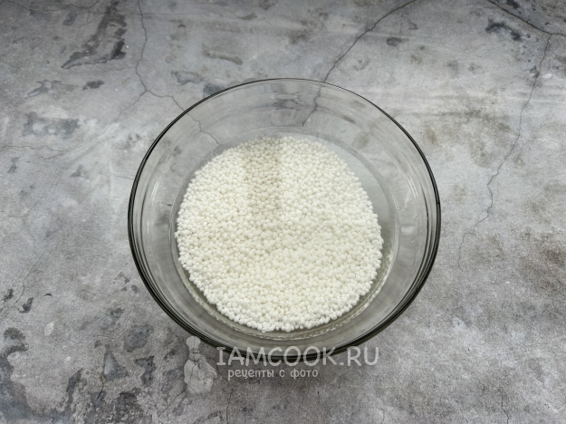 Промойте тапиоку холодной водой, пока вода не станет прозрачной. Затем замочите её в воде примерно на полчаса, чтобы жемчужинки набухли.