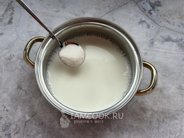 Налейте молоко в кастрюлю и добавьте сахар и ванилин. Поставьте кастрюлю на средний огонь и, постоянно помешивая, доведите смесь до кипения.