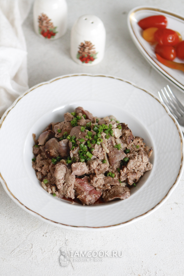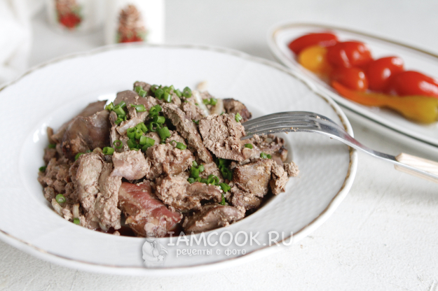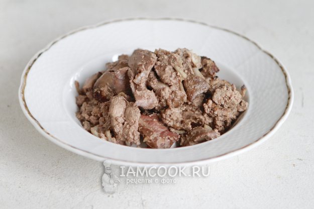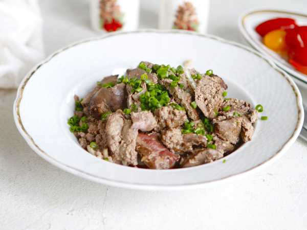 Готовность печенки обязательно проверяем. Чтобы убедиться, что печенка готова, разрежьте кусочек ножом. Если в разрезе нет примесей крови, значит куриная печень готова.
