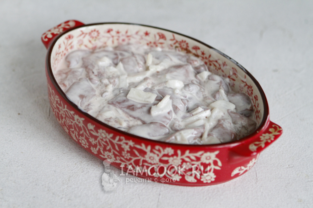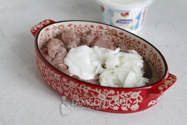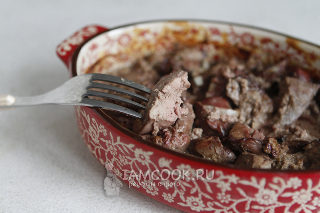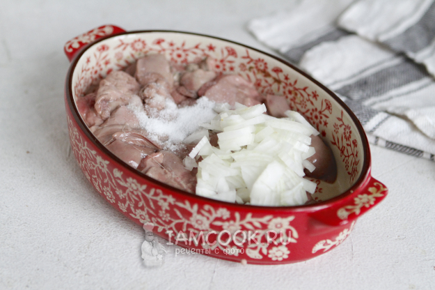 Куриную печенку нарежьте на кусочки одинакового размера. Я готовила в форме для запекания, поэтому не стала пачкать лишнюю посуду и сразу переложила печенку в форму.