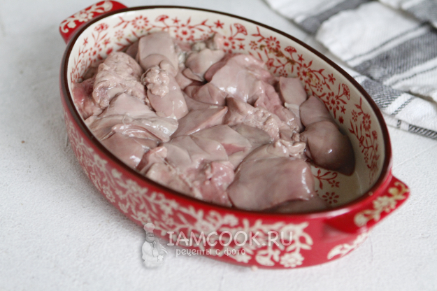 Куриную печень замочите в воде или в молоке минимум на 30 минут. Затем хорошо промойте под проточной водой и откиньте на дуршлаг. Удалите пленки и протоки, зачистите от сгустков крови.